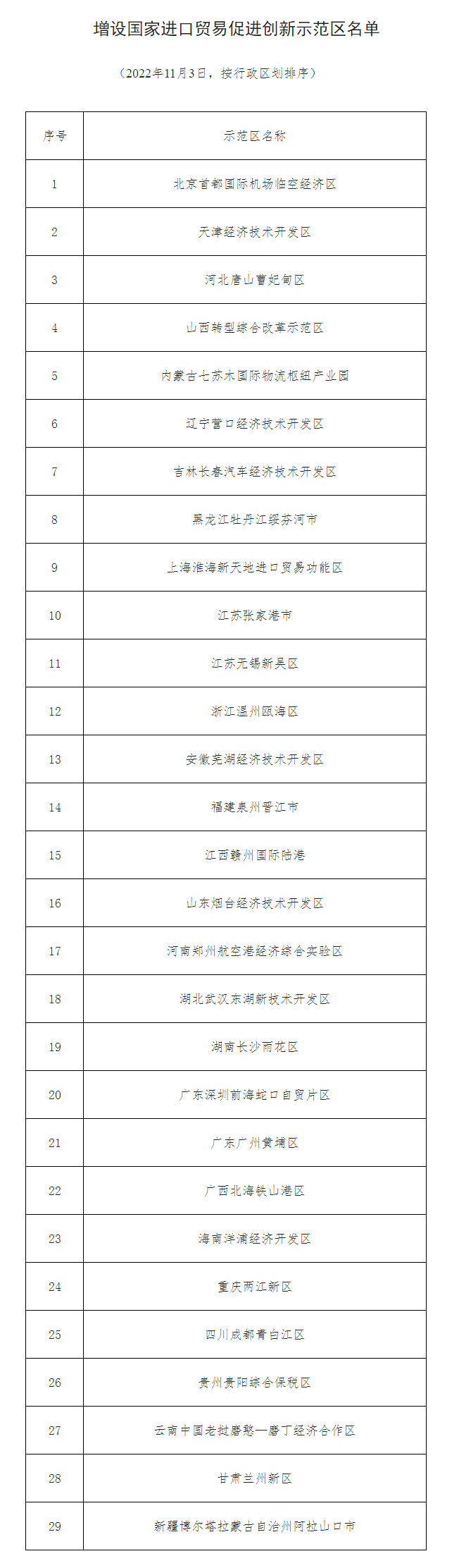落實習近平主席在第四屆進博會上宣布的“增設進口貿易促進創新示範區”重大開放舉措,商務部、發展改革委、財政部、人民銀行、海關總署、市場監管總局、外匯局、藥監局決定,在全國增設29個國家進口貿易促進創新示範區。 上一篇返回 列表 下一篇