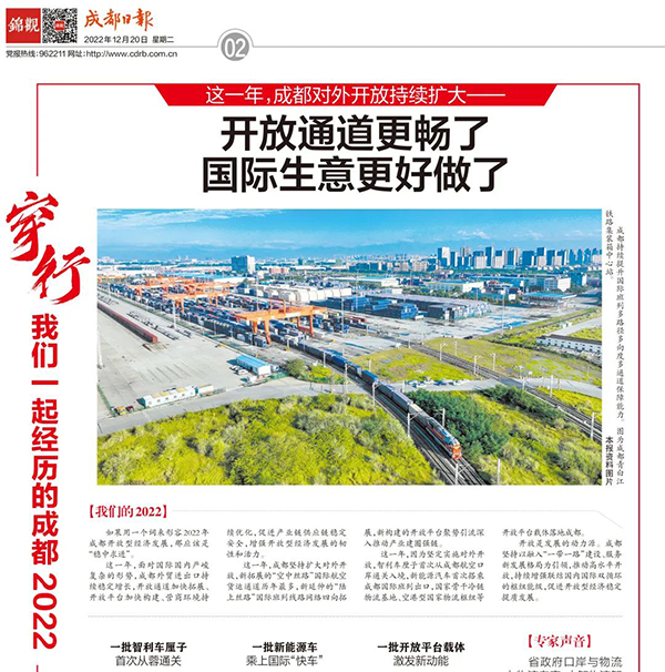 12月20日,成都日報刊發報道:《開放通道更暢了 國際生意更好做了》。報道表示,2022年,成都對外開放持續擴大,營商環境持續優化,國家骨幹冷鏈香蕉视频在线观看黄基地、空港型國家香蕉视频在线观看黄樞紐等開放平台載體落地成都,深入推動產業建圈強鏈。