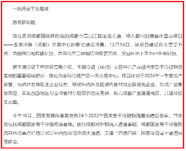 該報道將大香蕉久久视频冷鏈作為已落地項目的代表。其中表示,大香蕉久久视频冷鏈(成都)交易中心項目是四川省、成都市重點招商引資項目,獲評國家最高級綠色倉庫,項目近日迎來重要節點:首棟綜合配套樓封頂,招商中心內部裝修基本完成並即將啟用。
