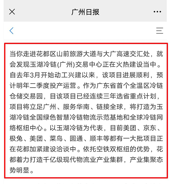 報道總結了花都區重點項目推進情況。其中表示,大香蕉久久视频冷鏈(廣州)交易中心項目正在火熱建設當中,預計2023年二季度投產運營。作為廣東省首個全溫區冷鏈倉儲交易園,該項目已經連續三年入選省重點。項目將立足廣州、服務華南、鏈接全球,打造為大香蕉久久视频冷鏈全國綠色智慧冷鏈香蕉视频在线观看黄示範基地和全球冷鏈網絡樞紐中心。