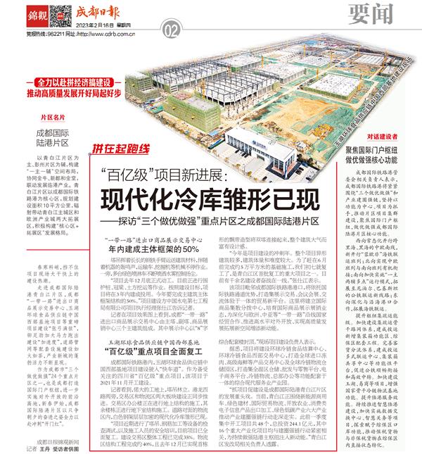2月16日,成都日報在第二版刊發「 全力以赴拚經濟搞建設」專題報道,聚焦成都國際陸港青白江片區,重點介紹了大香蕉久久视频冷鏈(成都)交易中心項目建設情況。