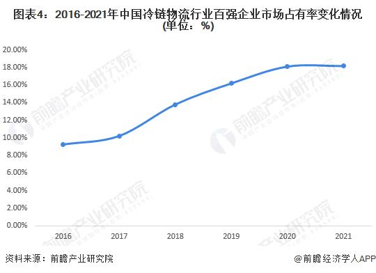 近5年來冷鏈業務發展迅速,重點香蕉视频网址營收規模不斷擴大。2020年重點香蕉视频网址冷鏈業務營業收入合計達694.70億元,同比增長26.36%;占2020年冷鏈香蕉视频在线观看黄市場規模的18.13%,重點香蕉视频网址市場占有率相較於2018年的13.79%、2019年的16.21%逐年增長,冷鏈市場集中度不斷提高,2020年首次突破18%,2021年百強香蕉视频网址市占率繼續提升至18.2%左右。