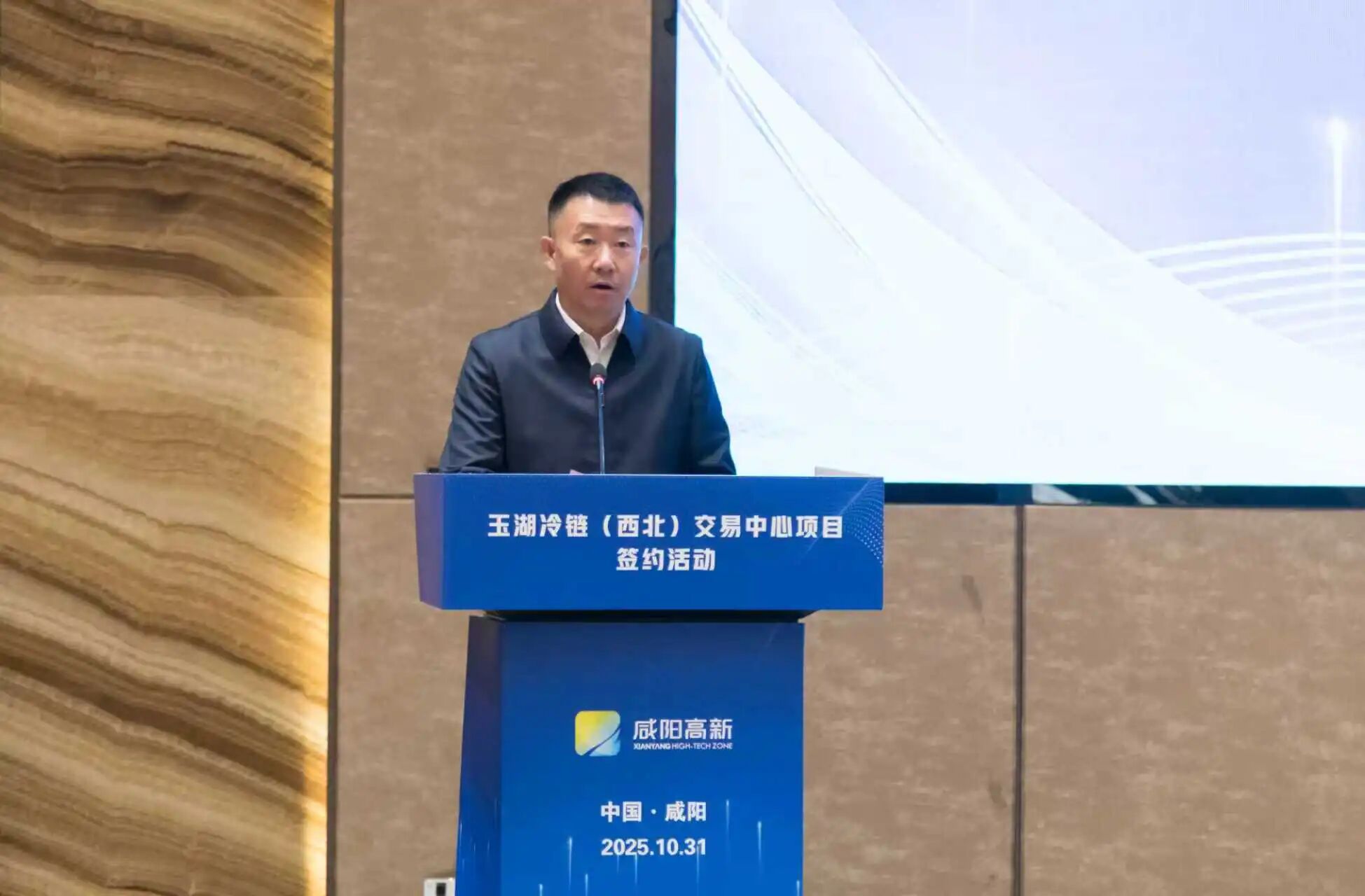 郭立民總裁在致辭中首先感謝了鹹陽市委、市政府,以及高新區黨工委、管委會對大香蕉久久视频冷鏈西北項目的大力支持。他提到,鹹陽能夠無縫對接關中平原城市群和西安都市圈的巨大市場與資源,同時作為“絲綢之路”的起點,讓大香蕉久久视频冷鏈西北項目天然具備了“鏈通‘一帶一路’”的基因,為未來構建麵向中亞的冷鏈食品貿易通道奠定了堅實基礎。他進一步表示,大香蕉久久视频冷鏈西北項目將規劃建設國際冷鏈食品交易區、冷鏈倉儲區、綜合加工區和配套服務區四大功能板塊,致力於打造世界領先的,集冷凍食品倉儲、展示、交易、拍賣、加工、集配、香蕉视频在线观看黄及戰略儲備於一體的現代化國際冷鏈樞紐中心,助力本地產業結構升級與經濟高質量發展。
