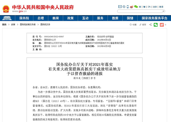 6月9日,國務院辦公廳發布《國務院辦公廳關於對2021年落實有關重大政策措施真抓實幹成效明顯地方予以督查激勵的通報》,對199個地方予以督查激勵,相應采取30項激勵支持措施。